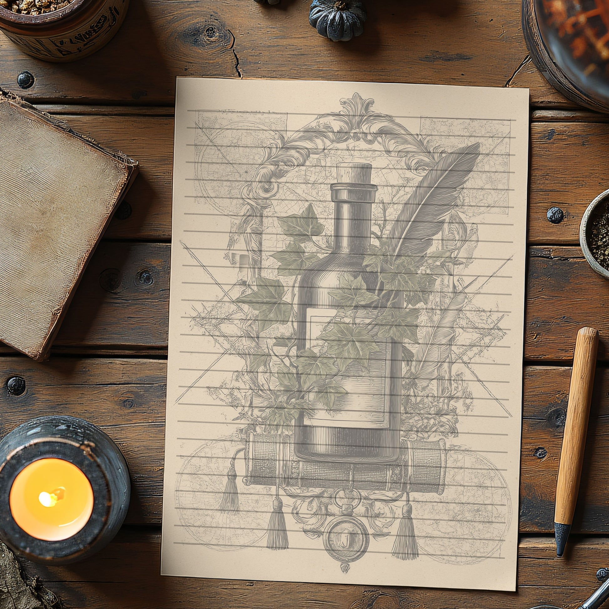10-pack Brevpapper - Vintage Vinflaska Dark Academia Grimoire / Book of Shadows Sidor - Tryckt A5 Papper - GP104