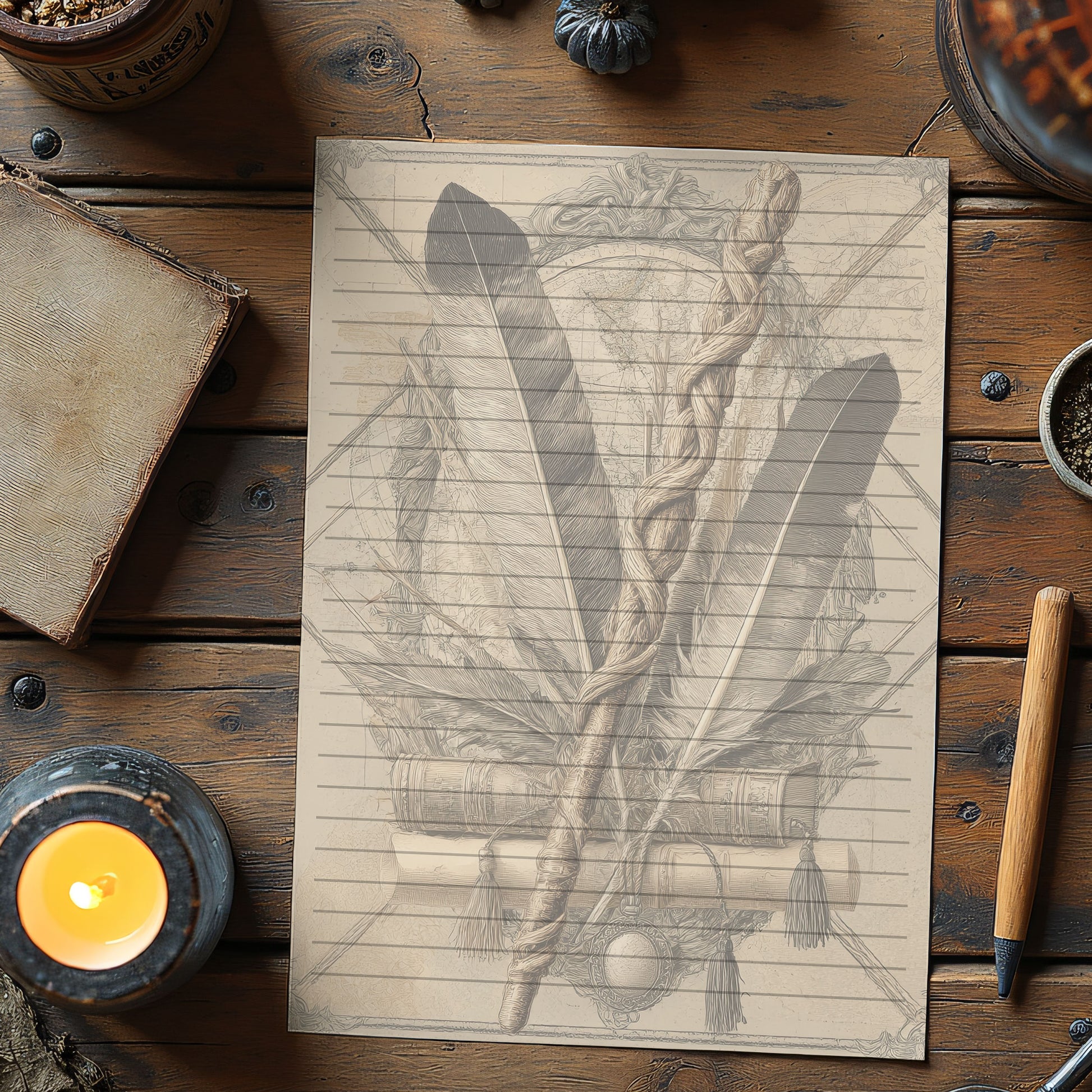 10-pack Brevpapper - Vintage Trollstav och Fjärdrar Dark Academia Grimoire / Book of Shadows Sidor - Tryckt A5 Papper - GP120