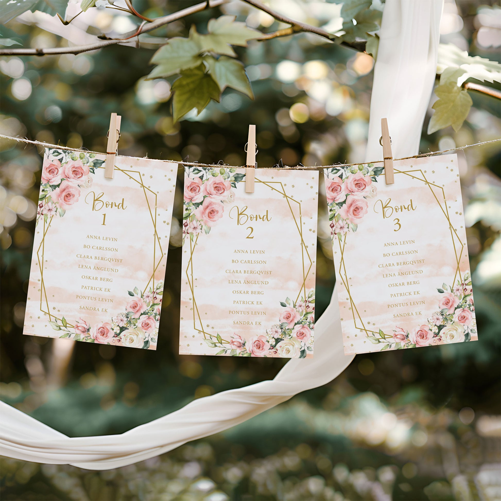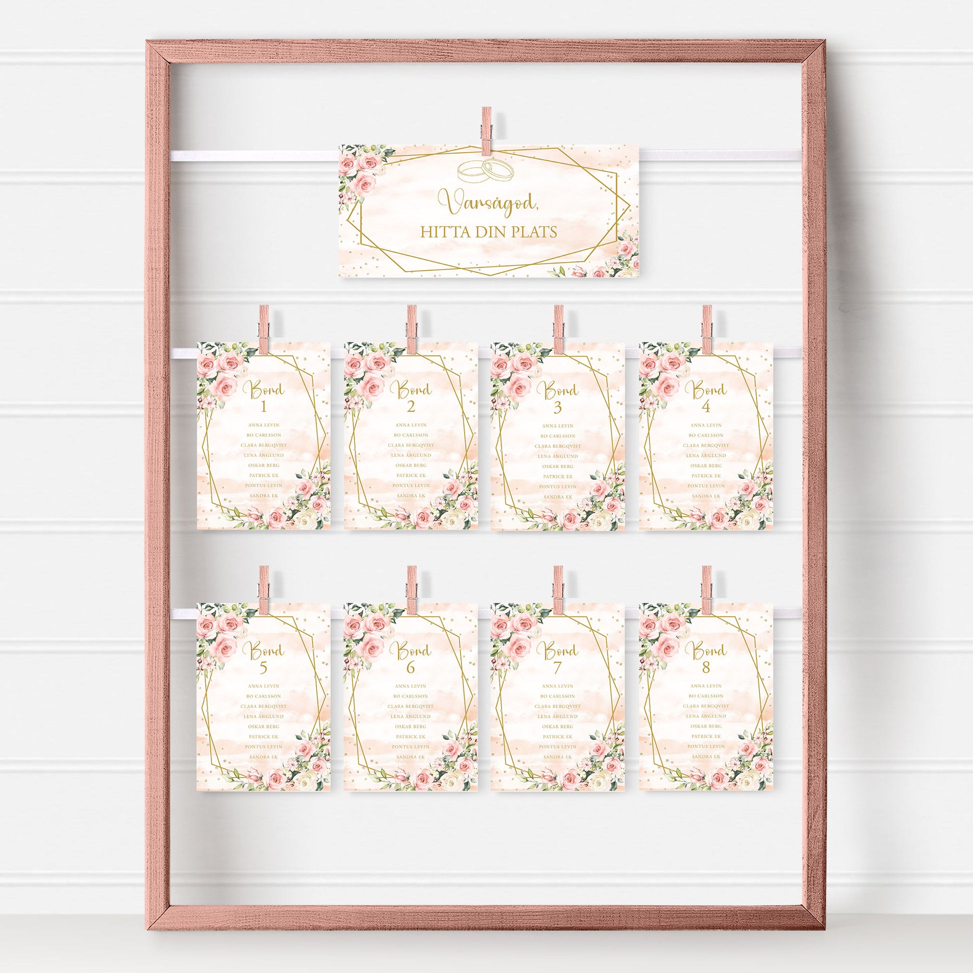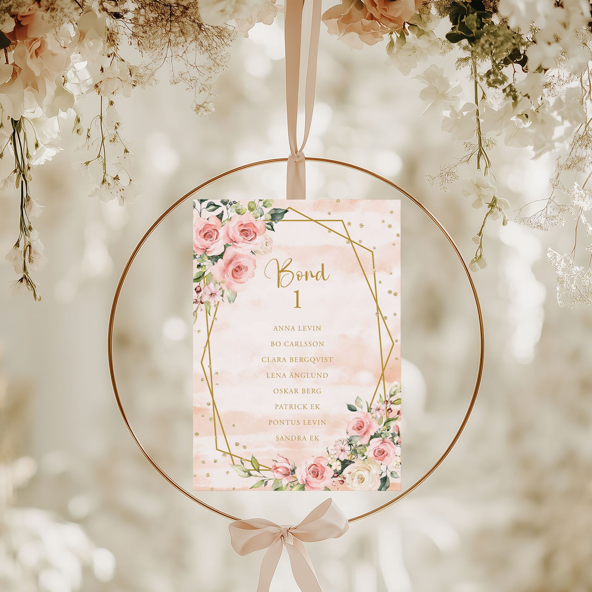 Bordsplaceringskort till bröllop – Rosa & Vita Blommor m gulddetaljer – Titelskylt & bordskort för gäster BR013