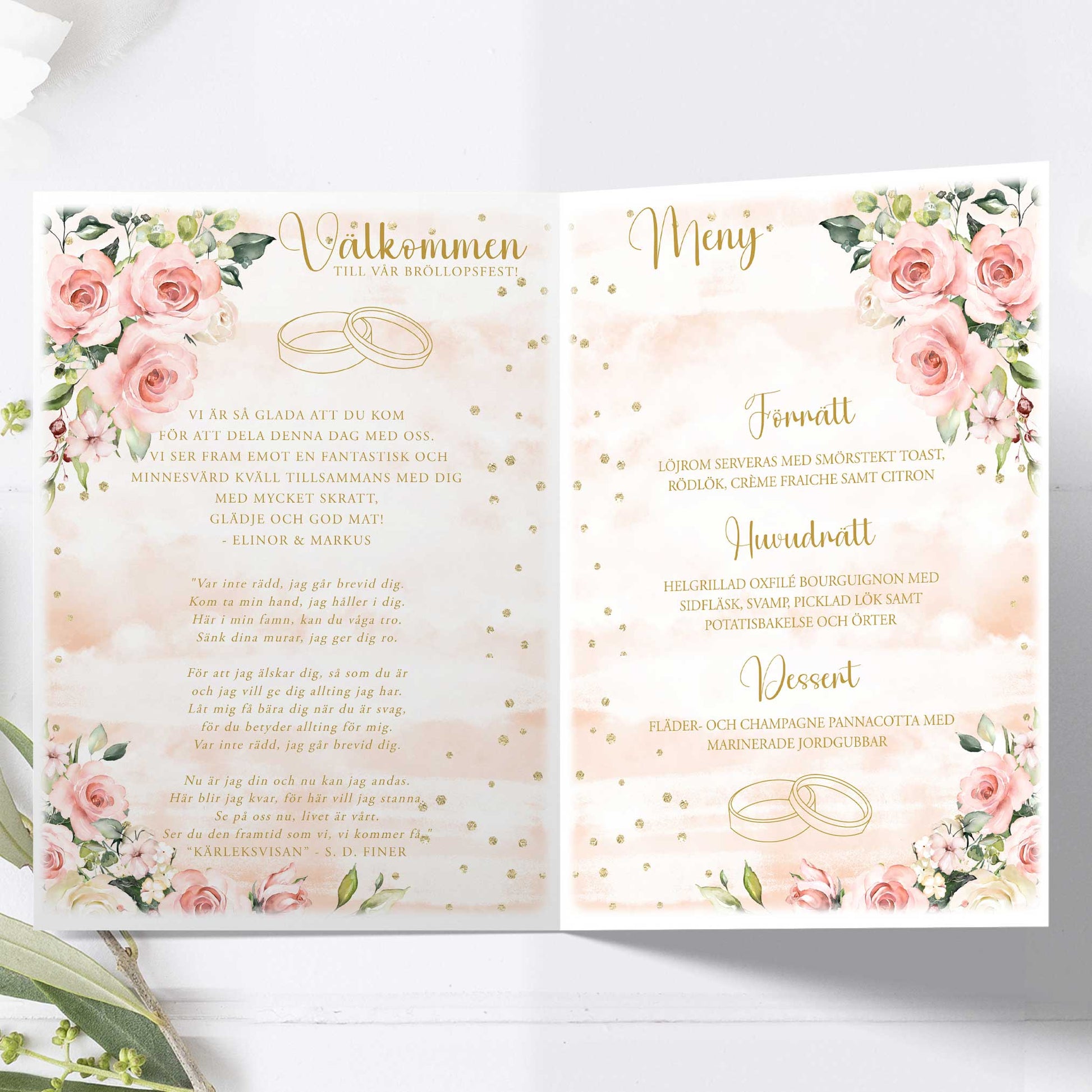 Festprogram litet, till bröllop – Rosa & Vita Blommor m gulddetaljer – Tryckt programkort 12,7x17,7 cm BR013