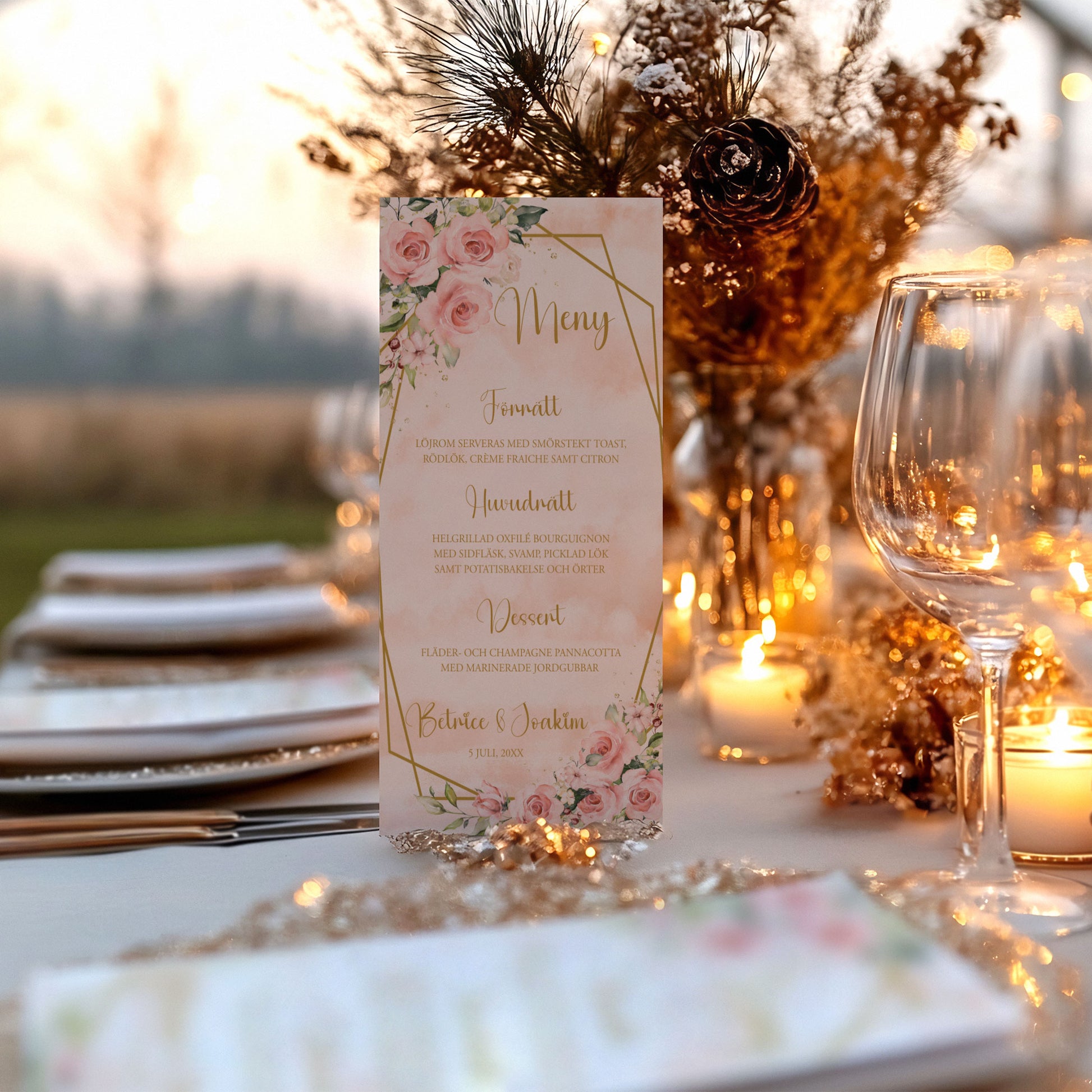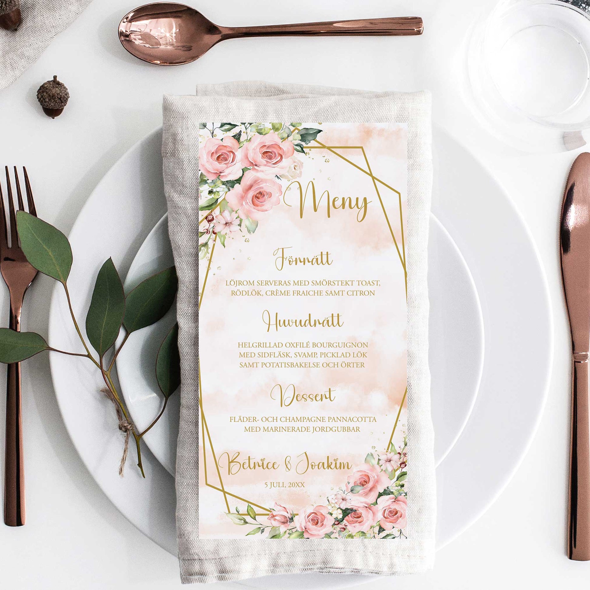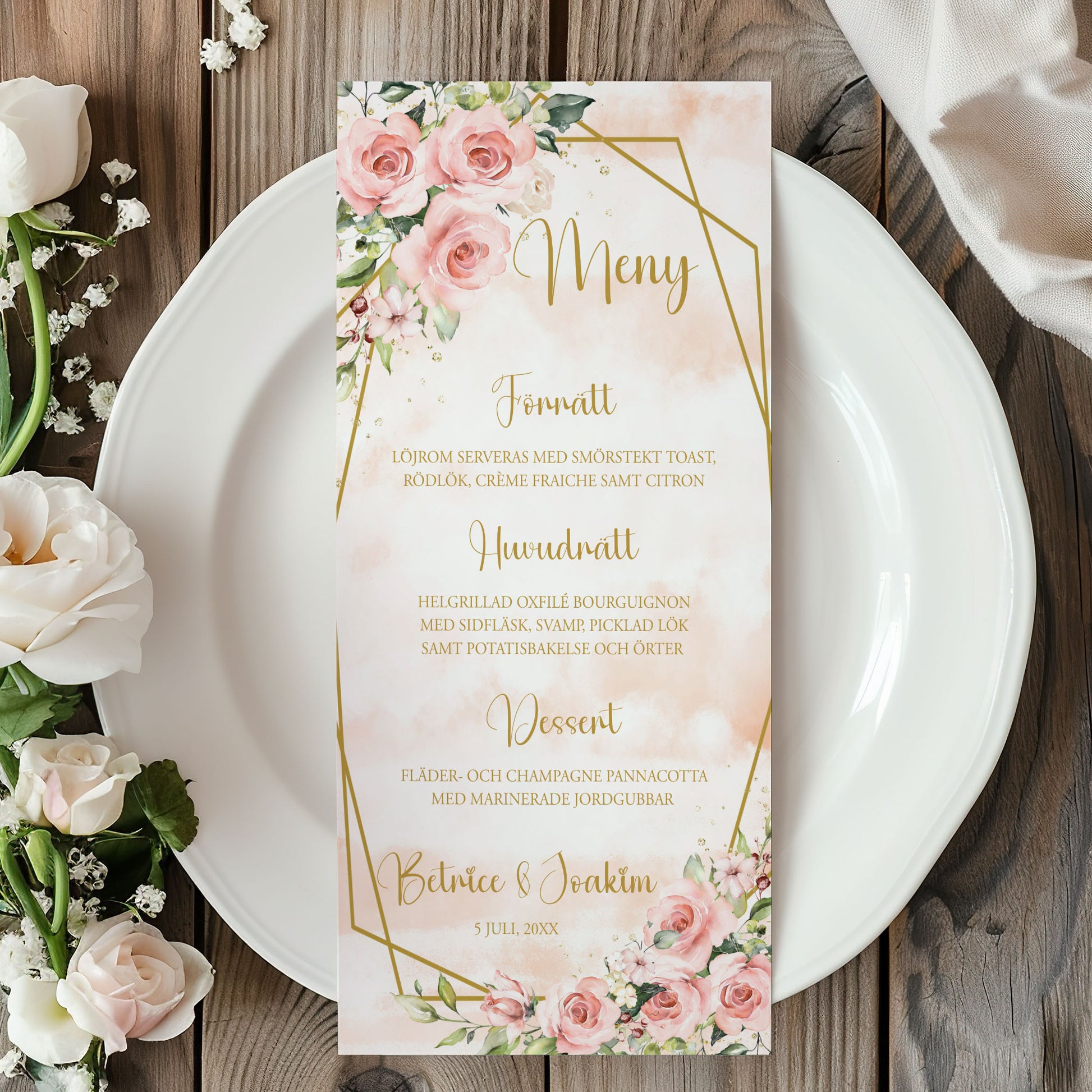 Menykort till bröllop – Rosa & Vita Blommor m gulddetaljer – Tryckt kort för bröllopsmeny BR013