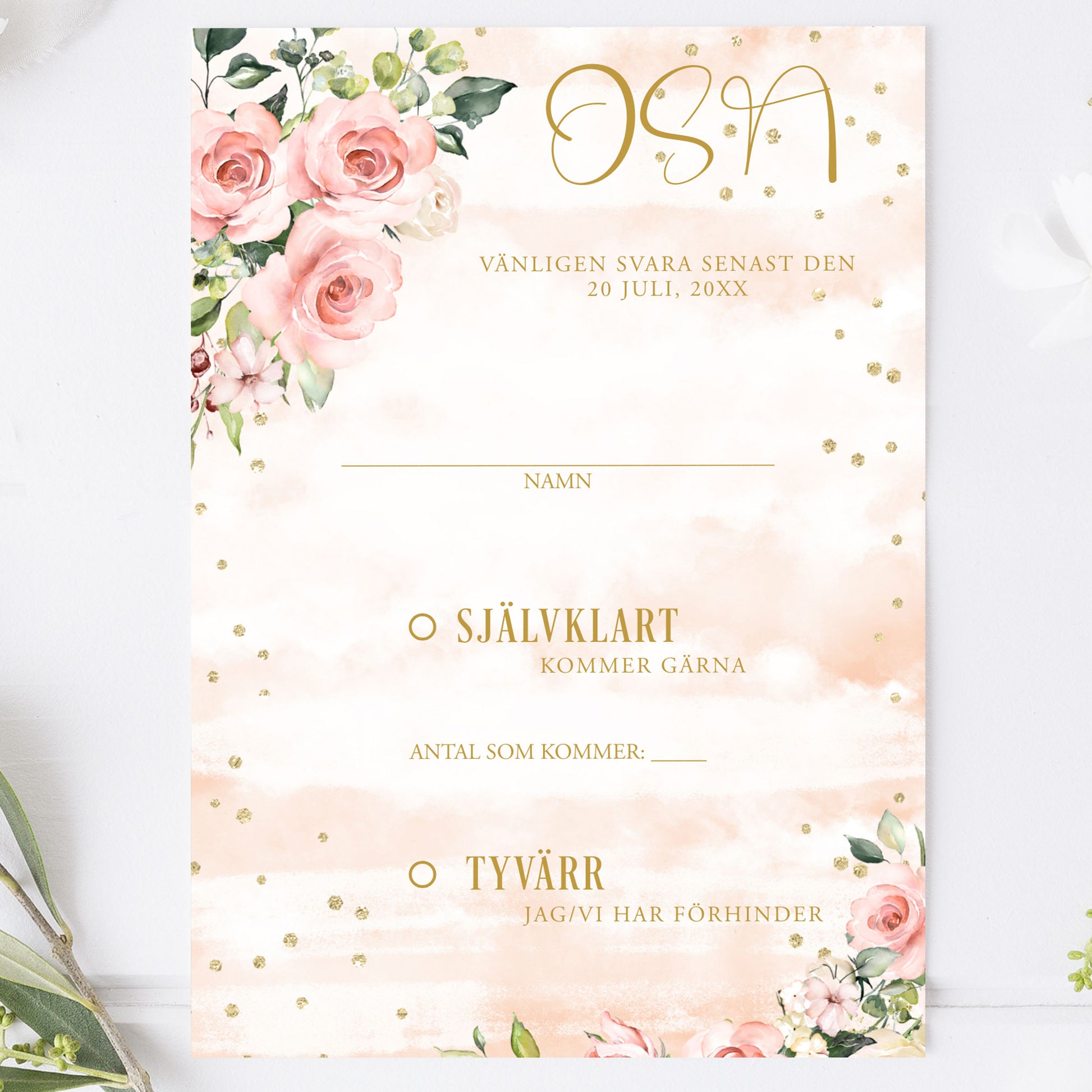 OSA-kort med kuvert (8 färger) – A6 Rosa & Vita Blommor guld detaljer – Bröllopskort BR013
