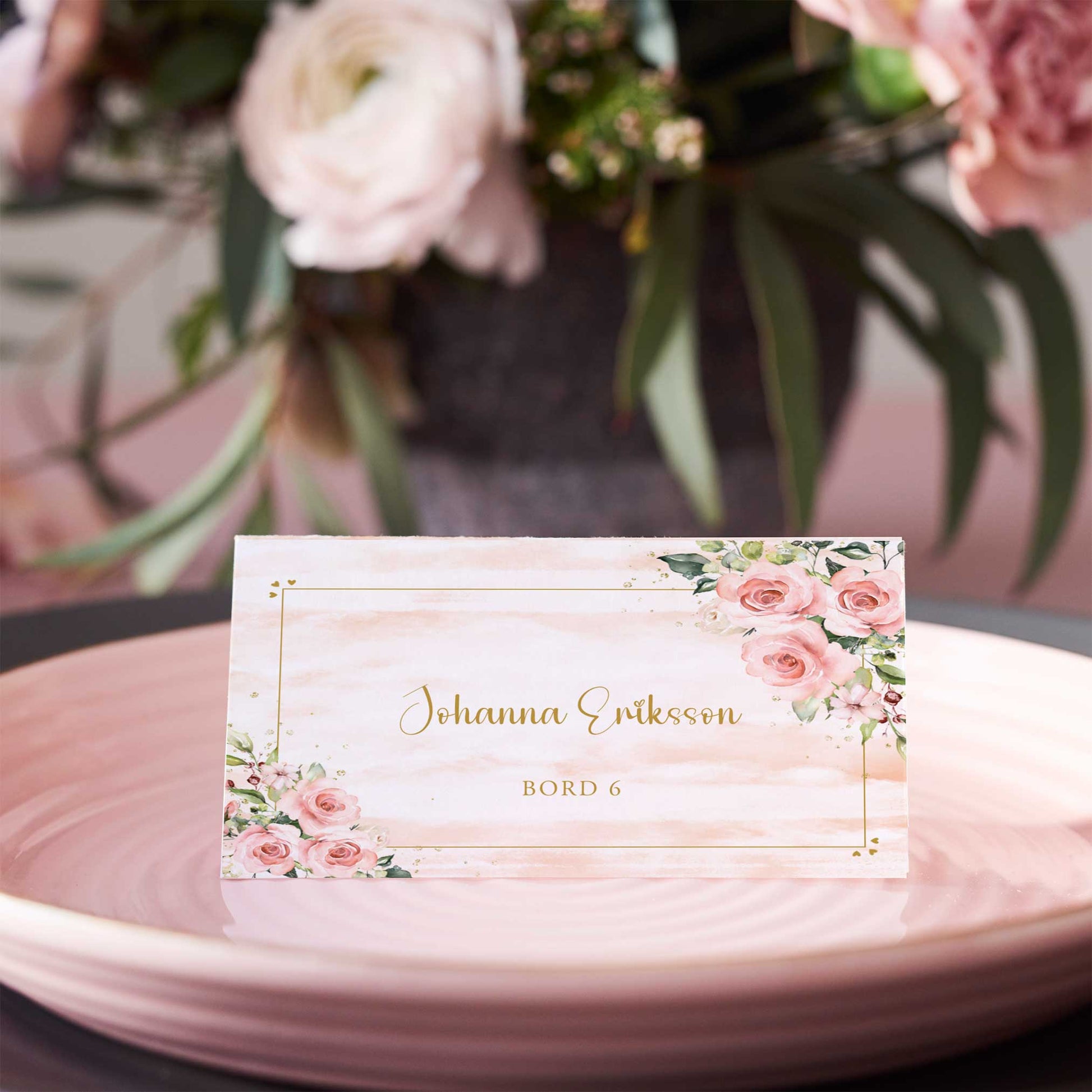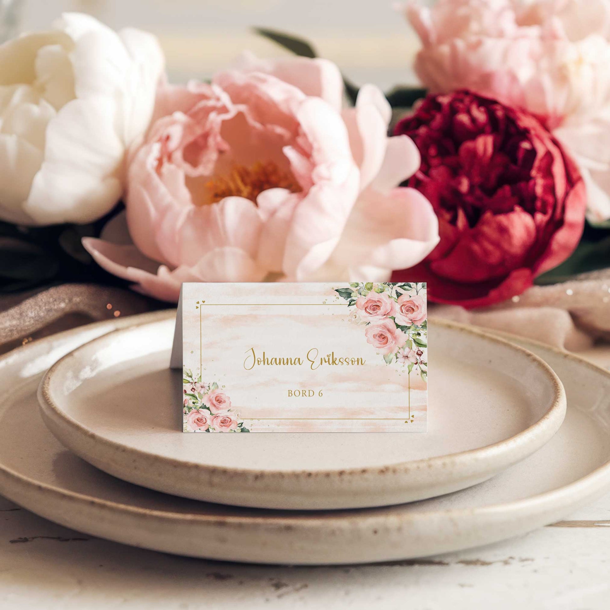 Vikta placeringskort till bröllop – Rosa & Vita Blommor m gulddetaljer – Tryckt kort med namn för dukning BR013
